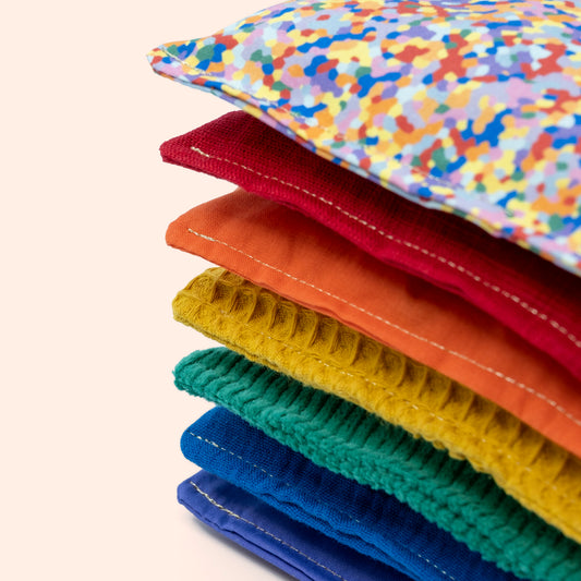 Voor een volwassene zijn de sensorische pittenzakjes misschien simpele zakjes. In de fantasiewereld van jouw kind is het een bedje, kussen, stapstenen om overheen te lopen. Voor gooi- en sorteerspelletjes of om mee te stapelen.