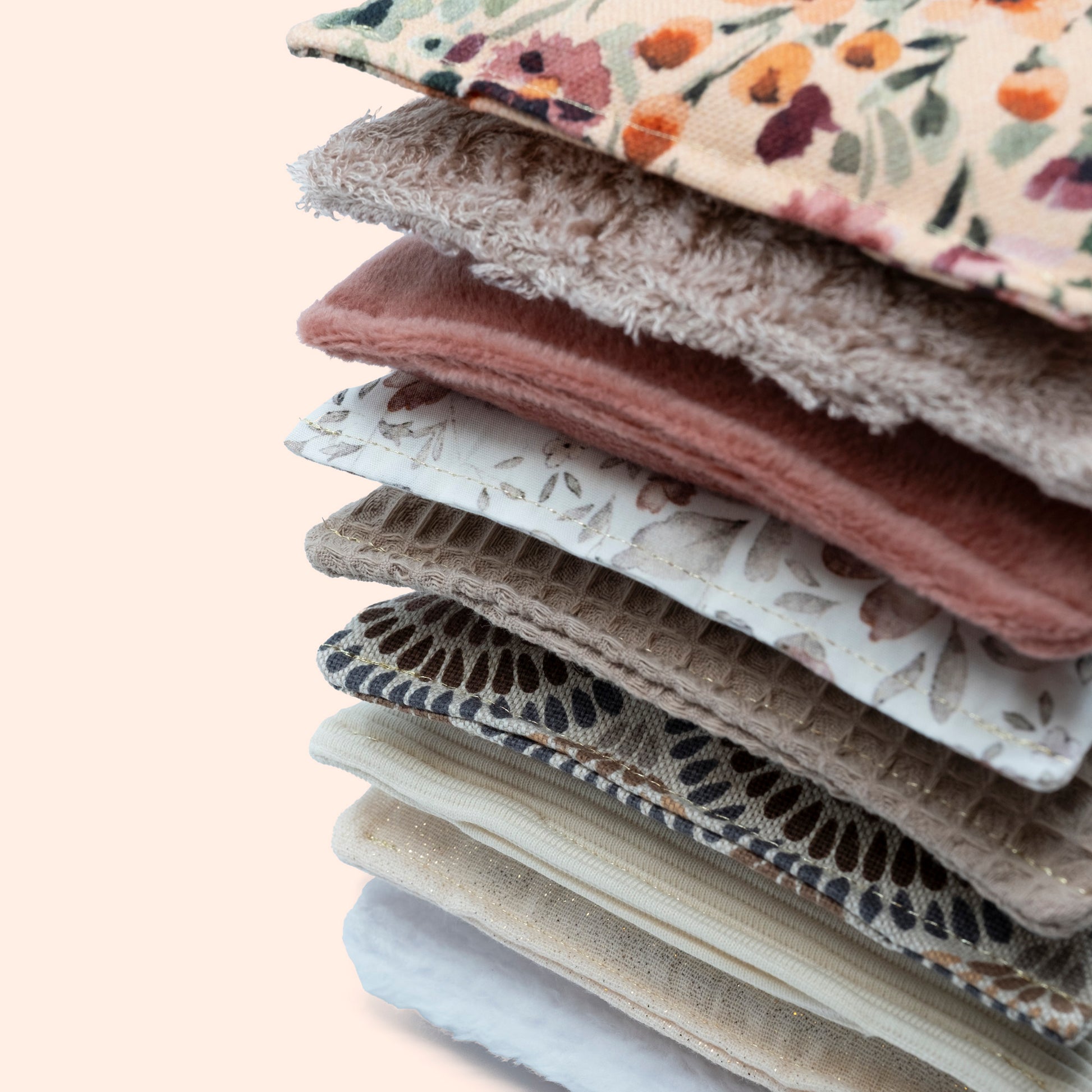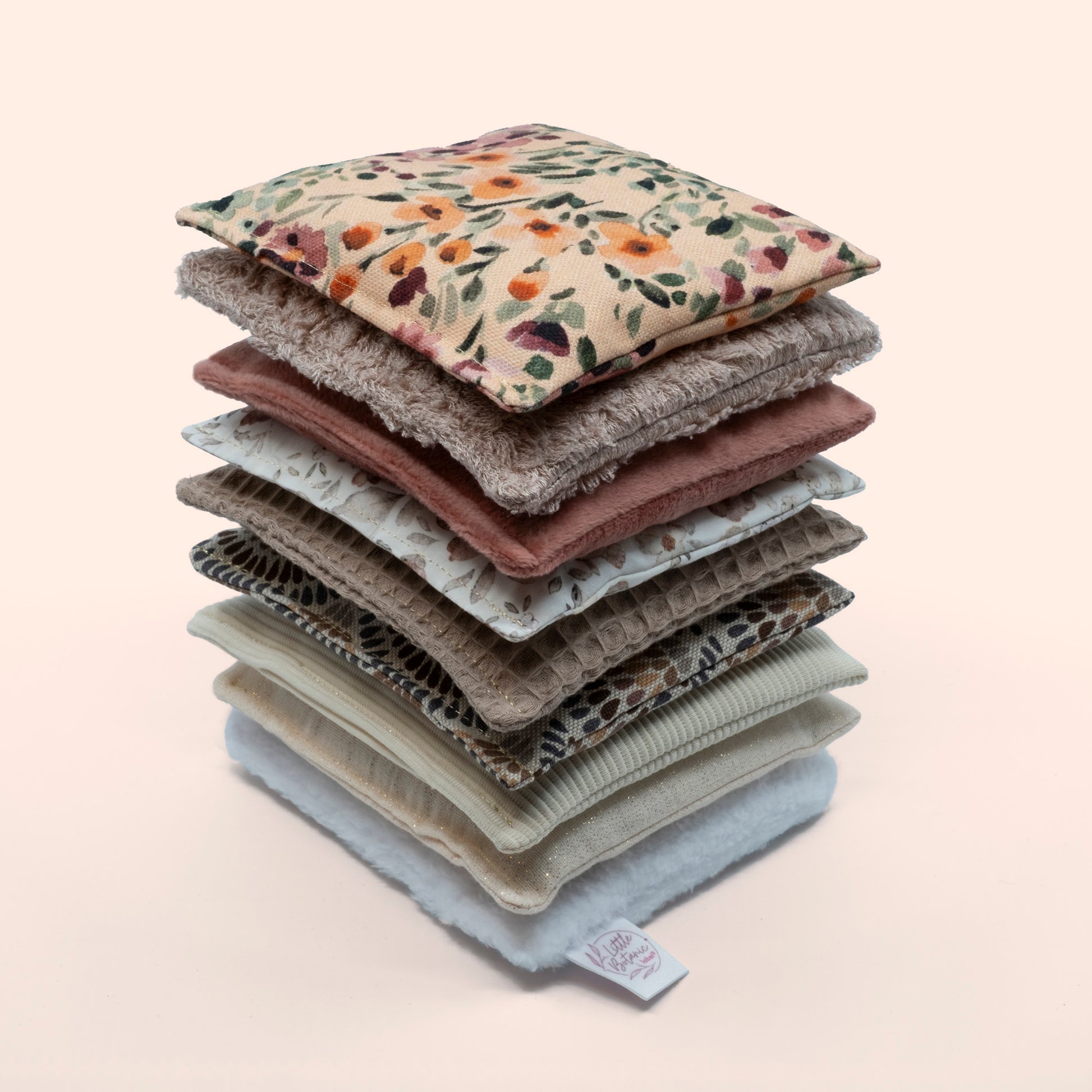 Omdat er al genoeg plastic op deze wereld is, vul ik mijn pittenzakjes met natuurlijke materialen, namelijk kersen-, druivenpitten en een mix daarvan. Voor de stoffen heb ik gekozen voor verschillende texturen en rustige botanische prints in aardetinten. Alle stoffen zijn voorzien van een OEKO-TEX keurmerk.